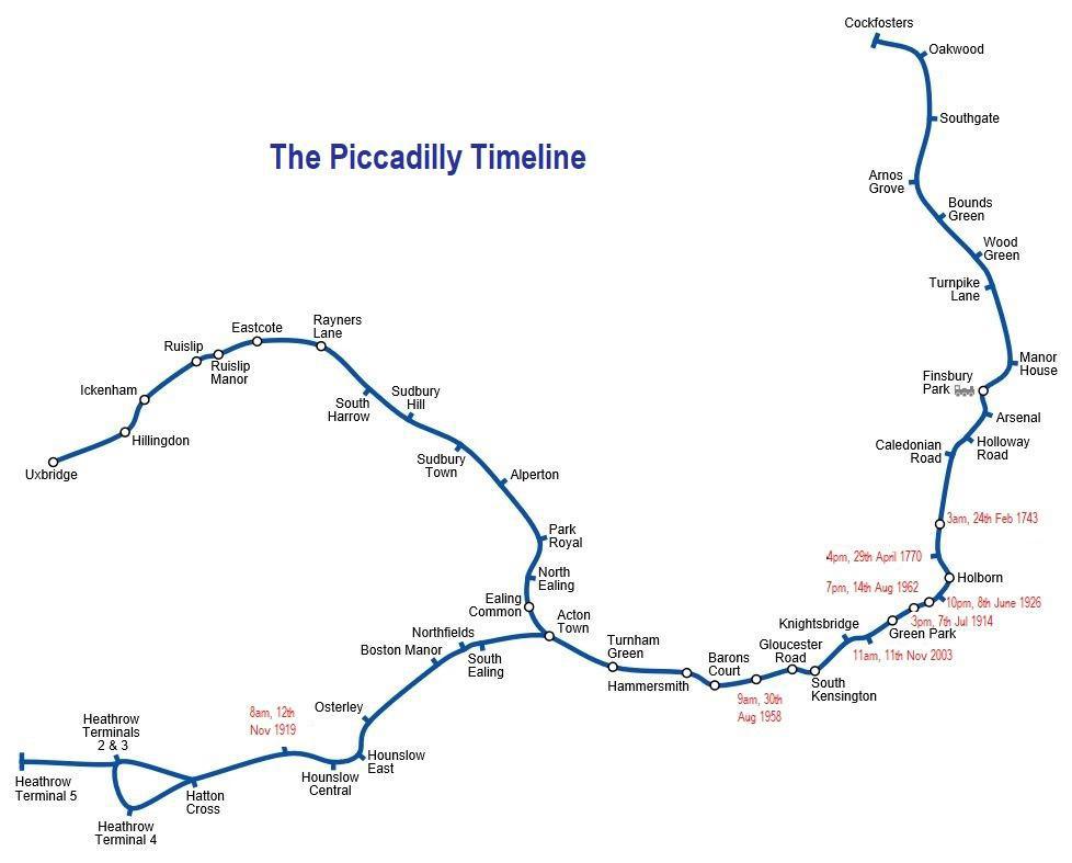 For this tour think of your Oyster as a Time Travel card. The tour is based on the Piccadilly Line, coloured dark blue (officially “Corporate Blue”), a deep level line stretching from Heathrow Terminal 5 to Cockfosters, south west through to north east London. It takes between 1 hr 39mins and 1hr 54mins to complete the journey, or about 350 years depending on your perspective!